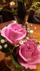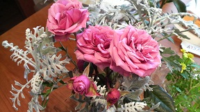 とはいえ、得たいのしれない黒くどろどろしたものなんかに呑まれないよう秘密のおまじない(?!)を要所要所にほどこし、うちの中は、今はもうすっかりクリスマスムードに。ひさびさにお花も買った。生協のレジの隣の生花コーナーの一束298円の束売りの中から、「僕が選ぶ!!」と言って、一際美しいバラをゆういちろうがチョイス。2本しかないので思い切って短く切って活けたら、思いの外ゴージャスに。バラはどうしてこんなに魅力的なんだろう。あたりが華やぐ華やぐ。